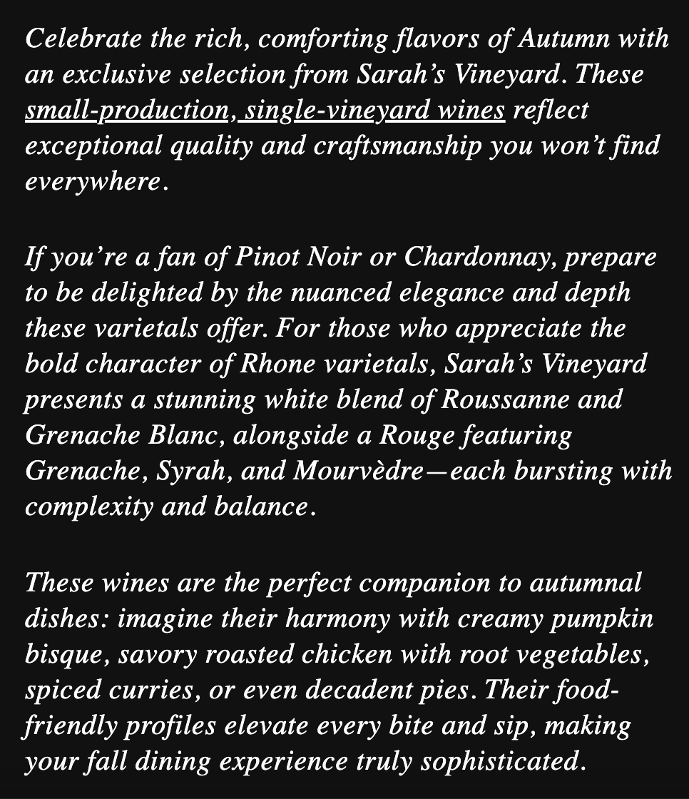 Sarah’s Vineyard Madonne Blanc, Sarah’s Vineyard Tondre’s Chardonnay, Sarah’s Vineyard Mun’s Pinot Noir, Sarah’s Vineyard Madonne Rouge
